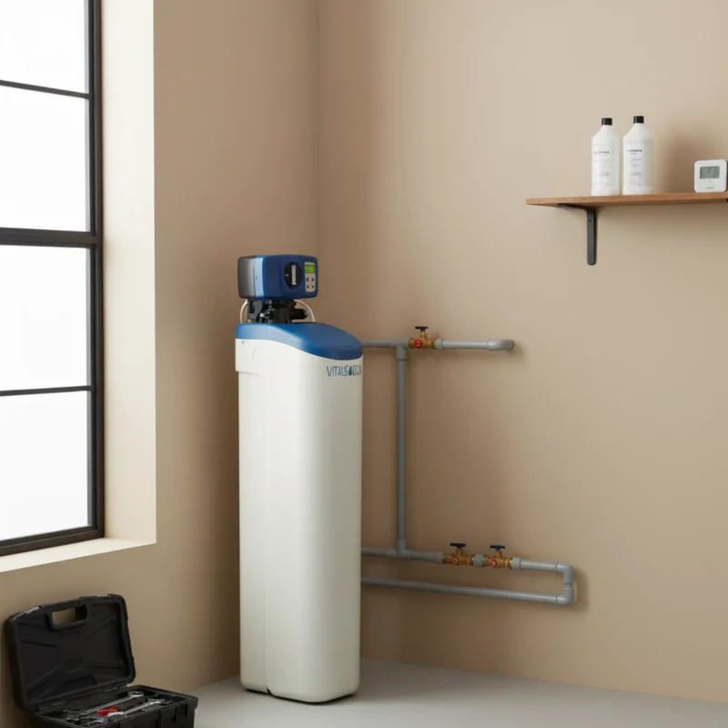 L’uso quotidiano è estremamente semplice: è sufficiente verificare la presenza di sale e mantenere il collegamento alla rete elettrica. L’installazione è rapida e richiede solo tre connessioni: entrata, uscita e scarico.