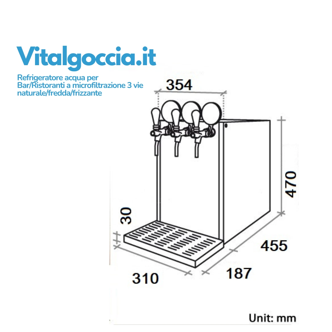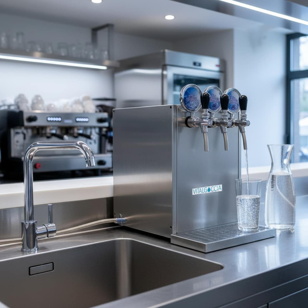Il refrigeratore acqua professionale Vitalgoccia da 120 litri/ora è la soluzione ideale per bar, ristoranti e attività del settore Ho.Re.Ca. che desiderano offrire acqua naturale, fredda e frizzante in modo efficiente, igienico e sostenibile. Grazie all’installazione sotto banco e agli spillatori inclusi, l’erogazione è comoda e perfettamente integrata nel banco di lavoro.