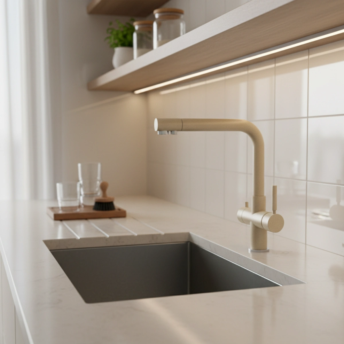 Il rubinetto Daliax 5 vie in granito avena è progettato per offrire un’esperienza completa nella gestione dell’acqua in cucina, con una finitura elegante in fragranite effetto pietra che si abbina perfettamente ai lavelli dello stesso materiale.