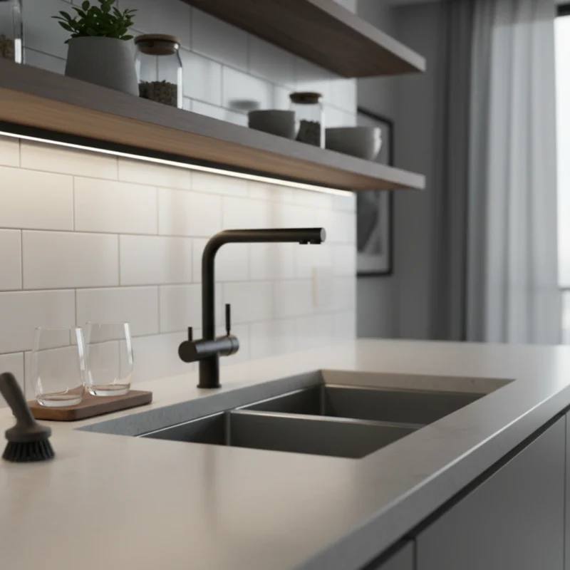 Estetica professionale: la colorazione nera opaca dona un tocco industrial e sofisticato, perfetta per lavelli e accessori cucina tono su tono.