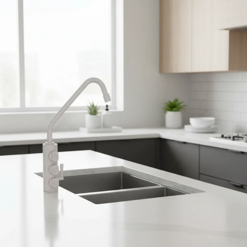 Struttura solida: il peso di 1,8 Kg testimonia la qualità costruttiva del rubinetto, pensato per garantire stabilità, durata e separazione sicura tra acqua di rete e acqua filtrata.