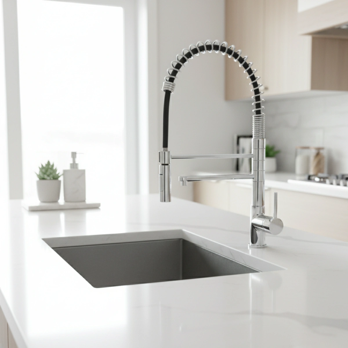 Il rubinetto Hylon a molla 3 vie è la soluzione ideale per chi cerca praticità e design professionale in cucina. Progettato per essere compatibile con impianti di depurazione acqua, consente l’erogazione separata di acqua calda, fredda e filtrata da un unico corpo miscelatore.