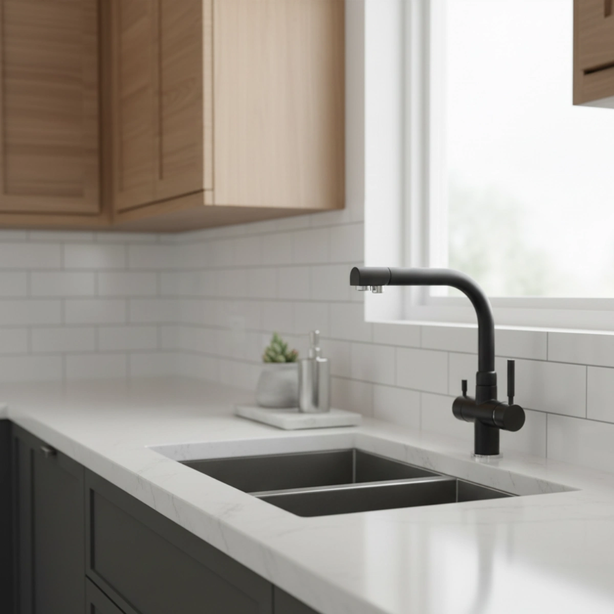 Il rubinetto Mirea 3 vie nero opaco rappresenta una soluzione che unisce eleganza moderna e funzionalità per la cucina. Il design minimale, abbinato alla finitura opaca, si integra perfettamente con lavelli scuri e ambienti contemporanei.