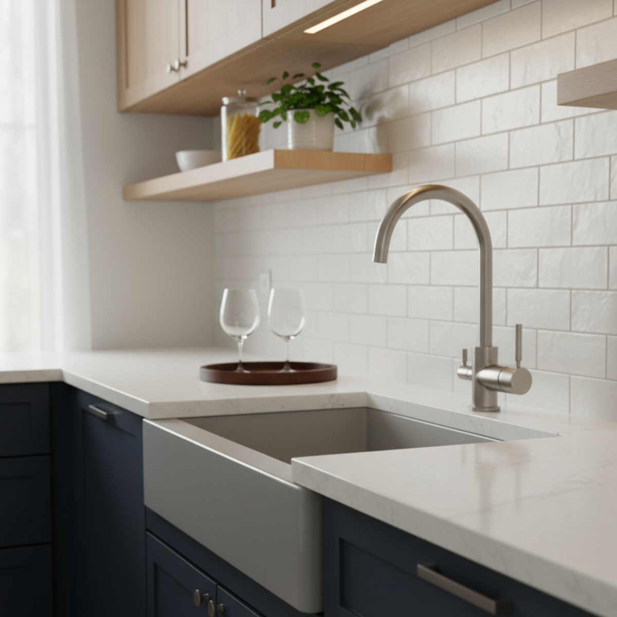 Finitura nickel spazzolato: sobria e resistente, si abbina con facilità a lavelli in acciaio inox e cucine moderne.